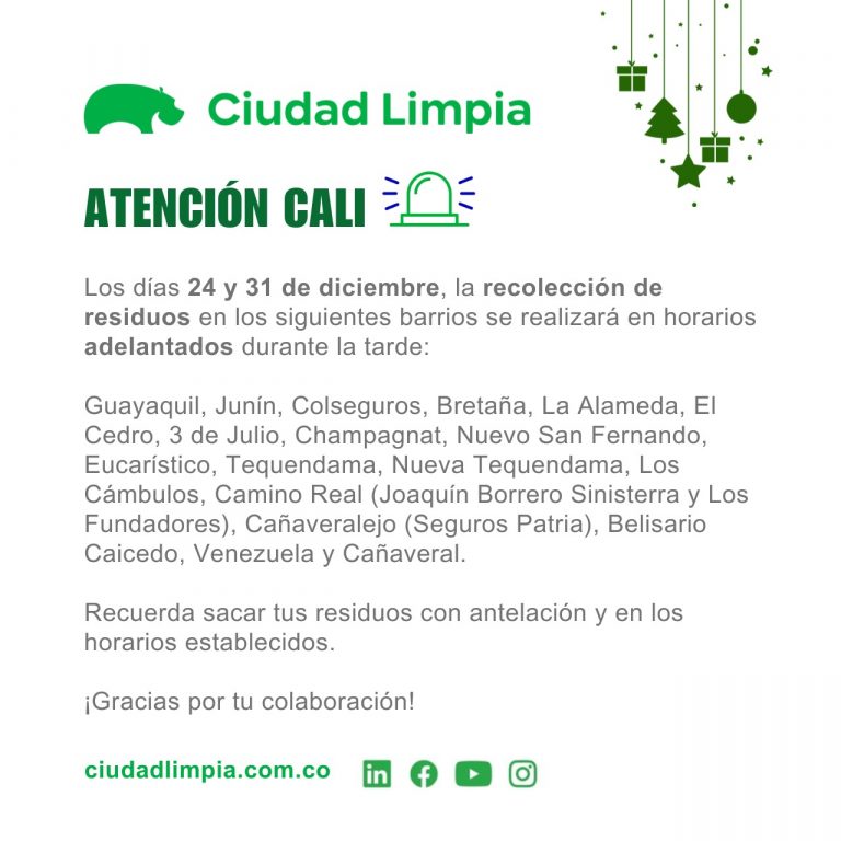 Los días 24 y 31 de diciembre, la recolección de residuos en los siguientes barrios se realizará en horarios adelantados durante la tarde.