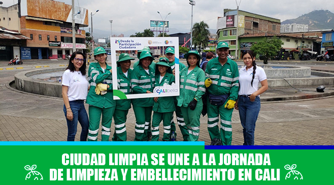 Ciudad Limpia le cumple a Cali 💚 participando en la jornada de limpieza y embellecimiento que se lleva a cabo en la plazoleta de las